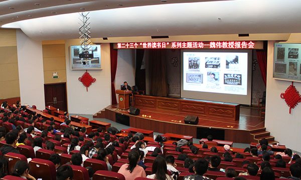 人间四月读书天,书香满径春风里。4 月 18 日上午,在图书馆第一学术报告厅,我校临床药理研究所所长魏伟教授应邀作了题为《学习、学习、再学习》的专场讲座,献礼 “世界读书日”。讲座由图书馆副馆长李桂芳主持,来自全校的近 400 名师生到场聆听。