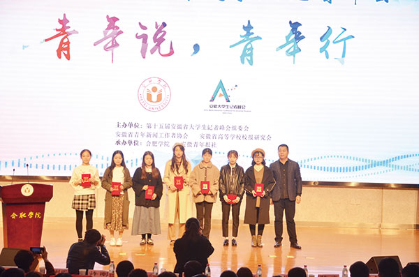 11月11日,第十五届安徽省大学生记者峰会在合肥学院图书馆学术报告厅顺利举行,峰会颁发了2018年度安徽省高校十佳校园记者、安徽省高校校园“好新闻奖”、“青年说,青年行”主题征文奖等多个奖项。我校学生记者余婷紫的作品《青春筑梦,担时代之责》、汪家琛的作品《心所在,路所向》分别荣获“青年说,青年行”主题征文一等奖和三等奖,吴问《直击Edvard Moser报告现场┃听诺奖得主为你揭示大脑的秘密》荣获“好新闻奖”新媒体类三等奖,赵雅丽《太极英姿(组图)》荣获“好新闻奖”图片类三等奖。