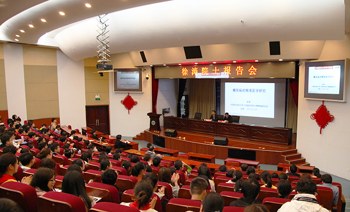 当天下午,徐涛院士在图书馆第一报告厅给我校师生作了题为《糖尿病的精准医学研究》的报告。随后,徐涛、张潇、沙薇分别赴我校第一附属医院、第二附属医院及临床药理研究所进行实地考察交流。各医院、研究所相关领导负责接待工作,并就医院信息化建设、临床项目深度开发等内容进行了深入交流探讨。