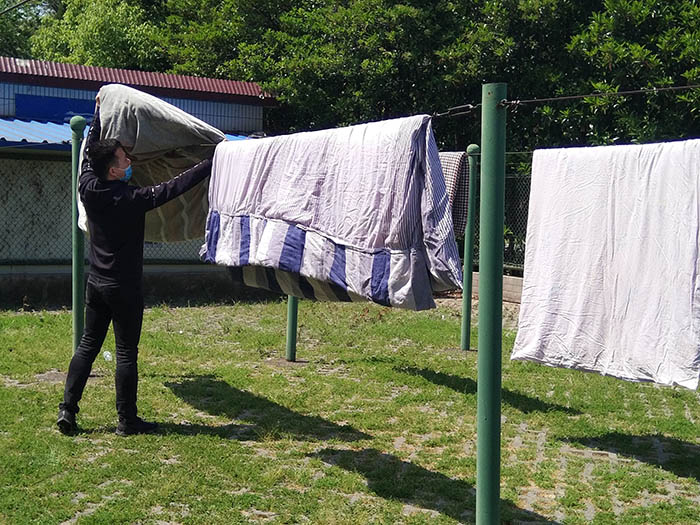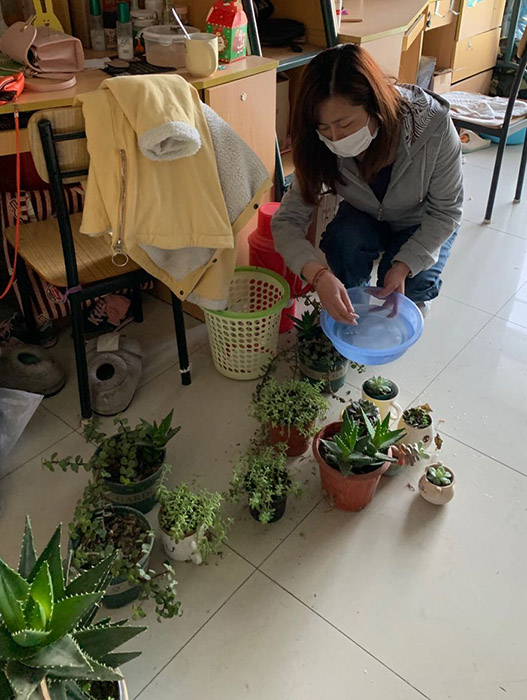 由于长期不在宿舍,学生被褥可能会因长时间没有晾晒而发霉、滋生细菌,各个学生公寓的宿舍管理人员在接到学生寻求帮助的信息后,便及时前往学生宿舍,替大家晒被、晒鞋、晒床单。苗龙是尚美楼1号的宿管员,假期中他“接单”了150余床被子的晾晒工作,为了避免混淆,他还细心地在被子一一贴好标签后再搬去楼顶晾晒。“我希望同学们能在返校后睡在被阳光照过的被子上,感受到温暖,不会因为在异地而孤单。也希望让他们知道,还有一个有求必应的宿管员。”在替学生晾晒被子之余,宿管员们还定期到学生宿舍为花草浇水,希望学子在返校后回到宿舍,仍能感受到那一抹生机勃勃的绿意。