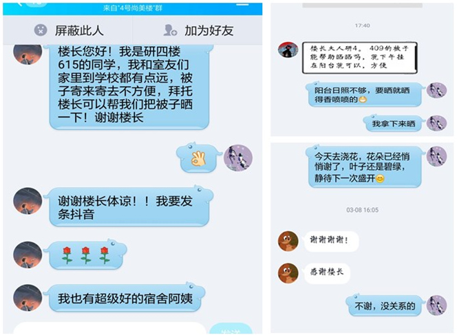 今年年初突袭的新冠肺炎疫情拉长了学子们的寒假,原定的返校时间因疫情防控被延迟。但我校宿舍管理人员对学子们的关爱“不放假”,从替学子晒被子、打理内务,到照料花草、及时寄送学习资料,他们在线“云接单”,线下齐服务,用贴心的行动温暖了学生,也温暖了校园。