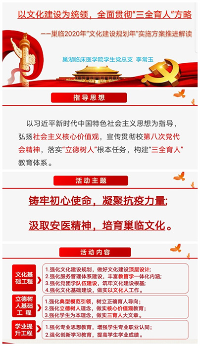 李常玉以《以文化为引领,全面贯彻“三全育人”方略》为主题,全面、系统、深入解读了正在实施的《巢湖临床学院学生党总支2020年“文化建设规划年”实施方案》。他强调,要把学生思想政治教育工作注入文化内涵和育人功能,全面贯彻落实校党委对总支提出的搭建好发挥学生服务平台、创建巢临专业品牌的要求以及打造具有巢临特色文化品牌的“三全育人”教育体系的奋斗目标。