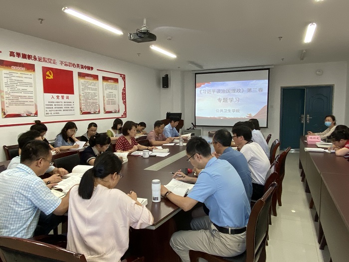 8月12日下午,公共卫生学院开展党委中心组学习,聚焦《习近平谈治国理政》第三卷,并就加强学院意识形态工作进行部署。会议由该院党委书记潘莉莉主持。