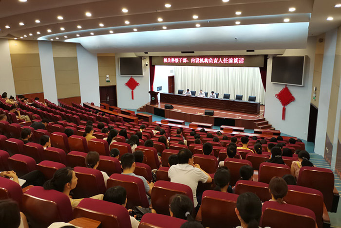 8月18日下午,机关党委在图书馆第一报告厅举行机关范围科级干部、内设机构负责人任前集体谈话。机关党委书记孙华峰,校纪委副书记、纪委办公室主任郑圣德出席会议,机关党委副书记孔建国主持会议。