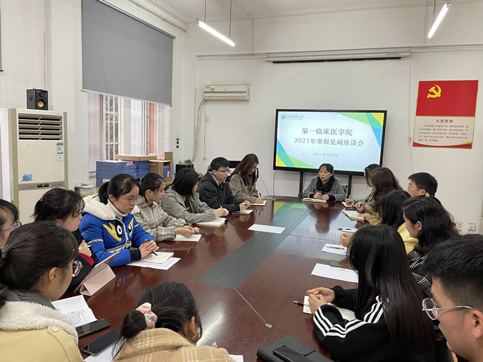 3月5日,第一临床医学院组织召开2021年学生寒假见闻座谈会。该院学生党总支副书记沈慧主持会议,各年级专业辅导员老师及学生代表20余人参与座谈。