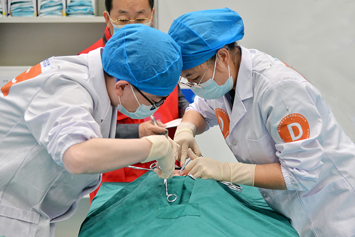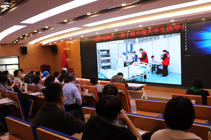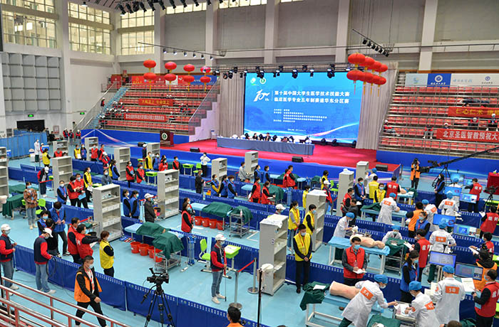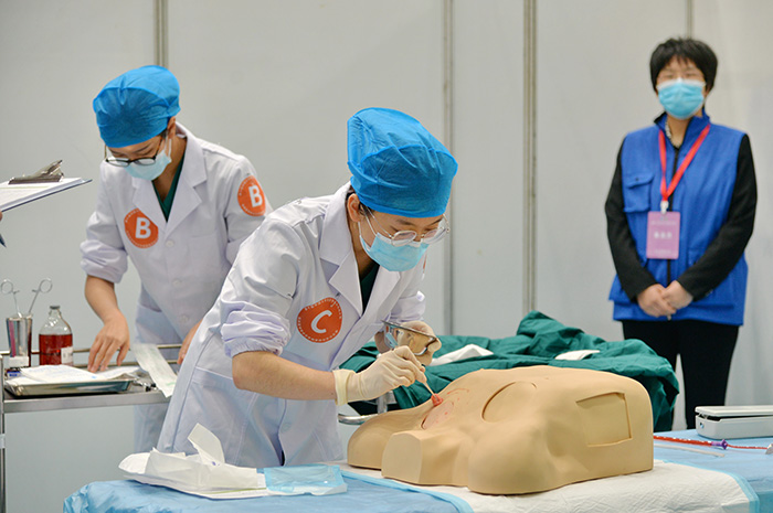 本次竞赛分初赛、复赛、半决赛、决赛四个部分,分别采用多站式、赛道式、单站式进行,考核内容覆盖内科、外科、妇产科、儿科、急诊医学、感染病学、诊断学、基础护理学等临床多个学科,均采用仿真模拟教学模型和标准化病人,高度贴近真实临床情景,以此全面考核医学生的素质、知识、能力以及医学人文和团队合作精神。