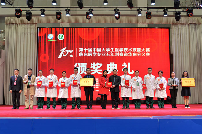 大赛中,来自46所高校的参赛队伍展开了激烈角逐,展示了深厚的理论功底和高超的实践技艺,显示了良好的应变能力和高度的团队精神,呈现了一场场精彩的医学盛宴。经过2天的高水平比拼,南昌大学、福建医科大学最终斩获本次华东分区赛特等奖,同济大学、蚌埠医学院、浙江中医药大学获一等奖,赣南医学院、温州医科大学、南京大学、南京医科大学、山东大学、山东第一医科大学获二等奖,上海健康医学院等34所高校代表队获三等奖。大赛还评选出单项奖20项,我校获最佳风尚奖。作为承办单位,我校不参与成绩排名,将与团体前11的参赛队一同晋级全国总决赛。