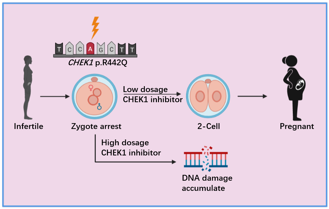 为寻找此突变造成的不孕症的解决方案,研究团队进一步利用CHEK1的抑制剂处理了引入了突变Chk1蛋白的小鼠的受精卵,经处理的受精卵进一步发育的比例大大提升,并可以在移植后出生健康的子代。研究还表明,低剂量的CHEK1抑制剂处理没有造成更多的DNA损伤,也并未造成显著的转录组改变。该研究揭示了人类早期胚胎第一次有丝分裂对DNA损伤检查点调控极其敏感,并提供了因CHEK1蛋白活性失调造成的不孕症的潜在解决方案。