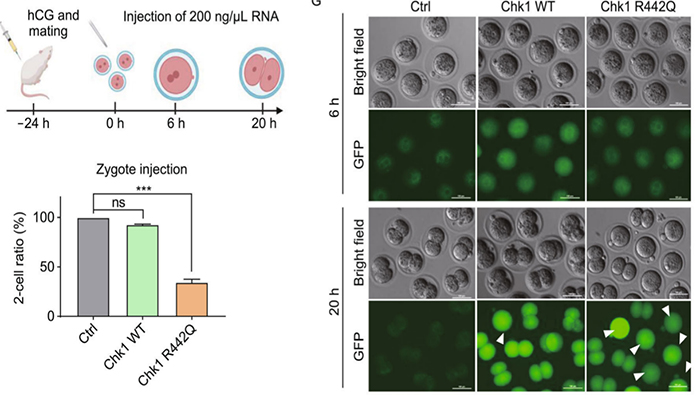 该研究从临床入手,通过对一例表现为受精卵卵裂失败的女性不孕家系进行全外显子测序及高效的生物信息学分析,发现了潜在的致病突变CHEK1 R442Q。作为DNA损伤检查点激酶,当细胞中发生DNA损伤时,CHEK1激酶活化,阻止细胞周期向下进行并启动修复程序,直到DNA错误修复或细胞凋亡。研究人员克隆了对应的小鼠Chk1突变mRNA,并通过显微注射的手段将其引入小鼠受精卵,突变的Chk1蛋白同样造成了半数以上小鼠受精卵第一次有丝分裂的阻滞。体外纯化的蛋白激酶活性实验表明,此突变显著提高了CHEK1激酶活性。升高的CHEK1激酶活性使得第一个有丝分裂检查点阈值过高,在不存在DNA损伤或错误的情况下,细胞周期依然无法向下进行。