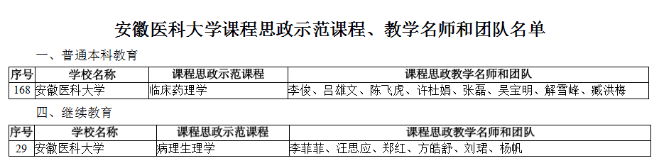 近日,教育部高等教育司公布课程思政示范项目名单,我校《临床药理学》入选普通本科教育课程思政示范课程,《病理生理学》入选继续教育课程思政示范课程,两门课程的教学团队获评“课程思政教学名师和团队”。