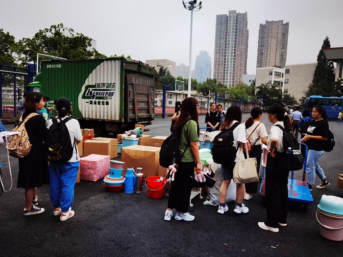 当天早上5点,晨光熹微,学生陆续将一件件行李搬到宿舍楼下,在志愿者的帮忙下,将其运输到既定的上货地点。一辆辆货车已在原地等候,学生物品有条不紊地被装载上车。搬迁现场,该院男同学积极帮助女生搬运行李箱,团结友爱、互帮互助的精神在这里得到实践。当客车在东校区停下的那一刻,同学们纷纷满怀欢喜地走下车,拥抱新环境,对新宿舍、新大楼点赞称道。