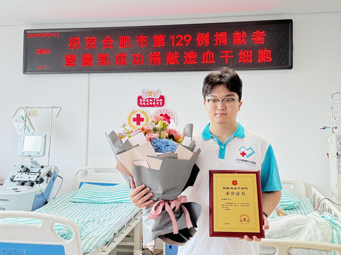 9月5日上午,经过近4小时的采集工作后,我校第二临床医学院2020级临床医学专业学生查晨凯,在合肥完成了270毫升的造血干细胞捐献,成为全国第18375例、安徽省第662例、合肥市第129例造血干细胞捐献者。据悉,他捐献的这份“生命种子”将被送往南京某医院用于救治患者。