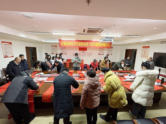活动现场,杜继双、石先益、鲍丙刚、单永强、张承业、汪清、王敏等7位安徽省高校书法家协会会员、校书画摄影协会会员挥毫泼墨,用笔墨将新年的美好祝愿融入一笔一划中,一副副饱含着浓浓年味、美好祝福的春联在大家的期待和赞赏中一一呈现。参加活动的教工主动抻对联、晒福字,地上摆的、墙上挂的满满当当,温馨美好在一副副春联中传递,诚挚祝福在一张张“福”字里显现,新春气息在一张张红纸的渲染下格外热烈,节日的喜庆气氛在书香墨韵中洋溢升腾。