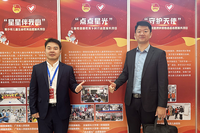 安医大一附院团委书记王晓虎和“点点星光”项目负责人孟佳林作为代表上台领奖。活动现场设置交流展示,对获奖项目在内的58个大赛优秀项目进行集中展示和重点推介。据了解,“点点星光”志愿服务项目由我校一附院团委与安徽太阳伞儿童慈善救助中心联合开展,涵盖志愿课程开展、课程讲义编写、志愿者讲师培训等内容,主要面向乡村留守儿童开展性健康知识教育志愿课程,旨在让留守儿童通过学习相关知识,正确面对青春期身体变化、学会防范性侵害。项目自实施以来,先后获得首届安徽省卫生健康系统青年志愿服务项目大赛一等奖(第一名)、第七届中国青年志愿服务项目大赛银奖等奖项。