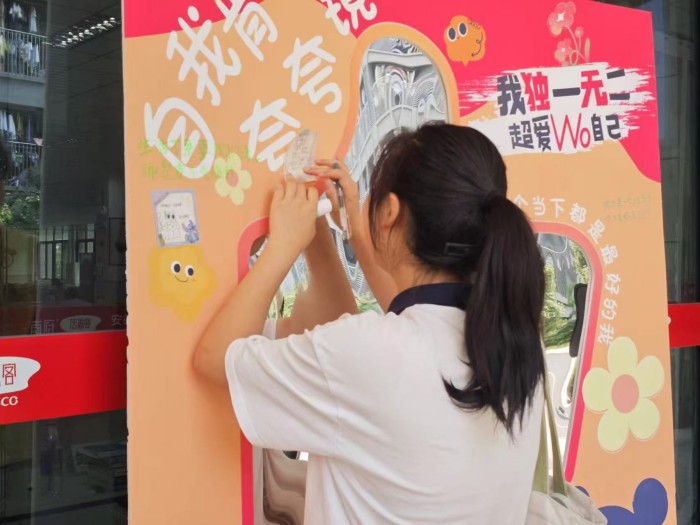 “镜中绽放·遇见更好的自己”环节同样精彩纷呈。现场设置的“夸夸镜”和“能量补给站”成为热门打卡点,同学们留下暖心便签互相激励。互动区域,“自我对话区”见证着同学们为自己加油打气的真挚话语,“温暖传递区”满是对他人的真诚赞美。活动还特别设置“夸夸盲盒”,一句真诚的夸赞即可换取神秘小礼品,既传递了善意,又收获了惊喜。