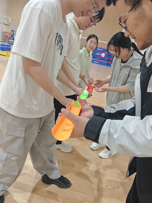 “珠行万里”项目中,各组队员手持PVC管道接力传送小球。面对小球不断滚落的挑战,同学们迅速建立起高效沟通机制,通过手势引导与语言提醒,在一次次失败中调整策略。当小球成功抵达终点时,现场爆发出热烈欢呼,团队成员在共同克服困难的过程中深刻体会到信任与协作的力量。最具创意的“第六感足球”项目,蒙眼选手需感受失去视觉的情况下,如何与队友建立信任关系,依靠其声音指引完成射门挑战。当盲行的队员精准触球得分时,现场响起的掌声既是对技巧的赞赏,更是对团队协作能力的认可。