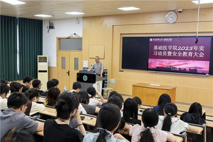 6月6日下午,基础医学院在校本部召开主题为“树立三个意识 培养过硬本领”的2025年实习动员暨安全教育大会。院党委书记储兵作动员讲话,院党委副书记、纪委书记冯利杰主持会议。2020级优秀实习生代表、2021级全体实习同学参加会议。