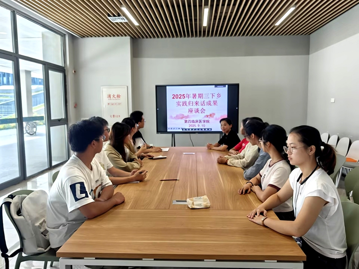 9月10日下午,第四临床医学院在新校区星瀚居学生宿舍五号楼一楼会议室,召开“实践归来话成果”三下乡总结交流会。院党委副书记余皖婉出席座谈会,与参加暑期“三下乡”的师生代表回顾交流实践活动的丰硕成果。
