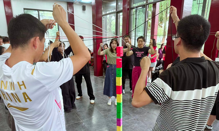 团队凝聚力建设环节,“拍拍操”“极速卡牌”“一圈到底”“合力建塔”等丰富多样的协作训练项目依次开展,现场欢声笑语不断,原本分散的个体逐渐凝聚成紧密协作的集体,团队凝聚力在轻松互动中得到显著提升。​心理赋能减压环节则聚焦教职工内心需求,通过专业心理技术帮助大家掌握自我调适方法。参与活动的教职工纷纷表示,这些专业训练不仅缓解了当下的紧张情绪,更学到了实用的心理调节技能,为今后平衡工作与生活、应对压力挑战提供了有效帮助。